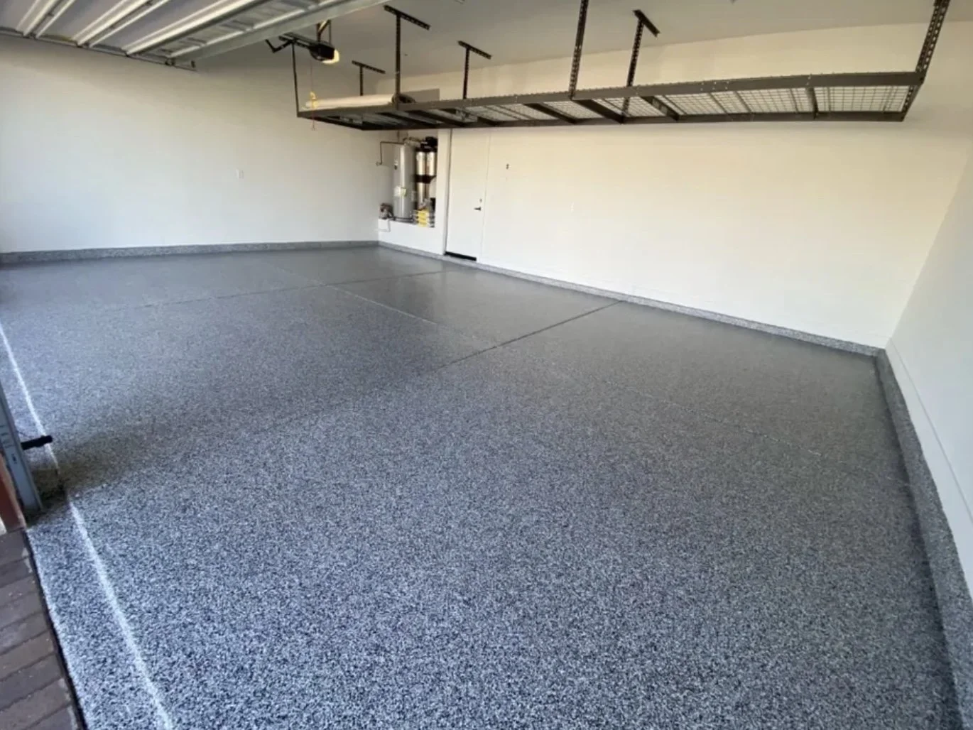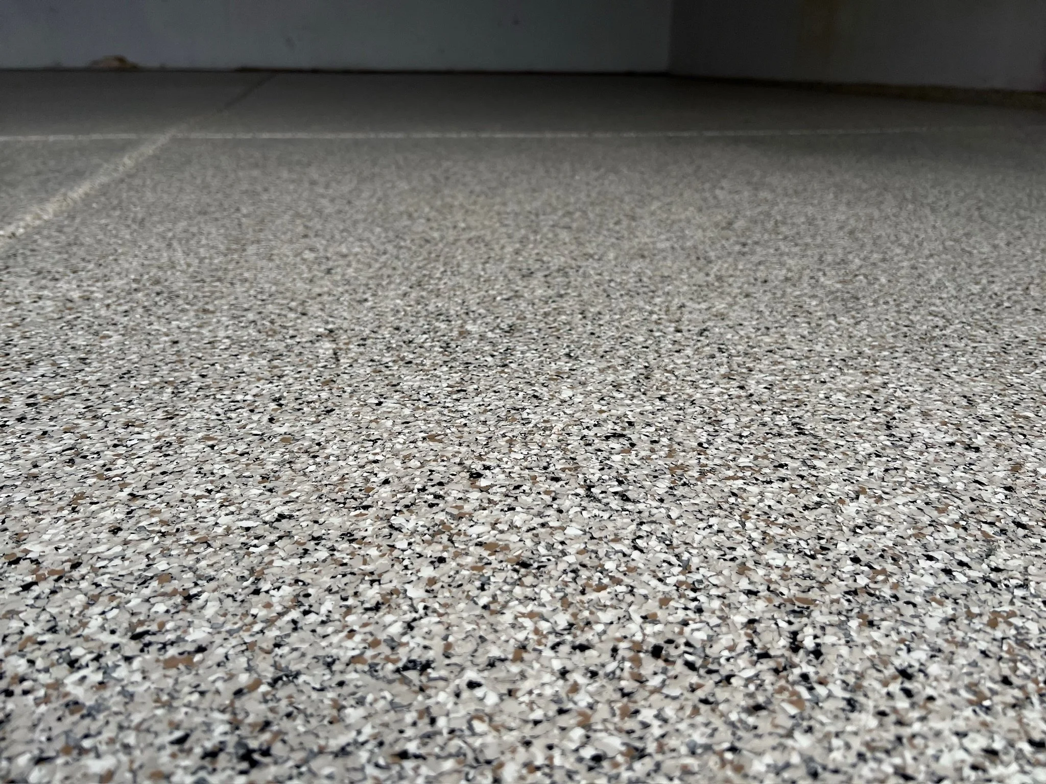 Close-up view of a textured, speckled gray and white epoxy garage floor with a dark wall in the background.