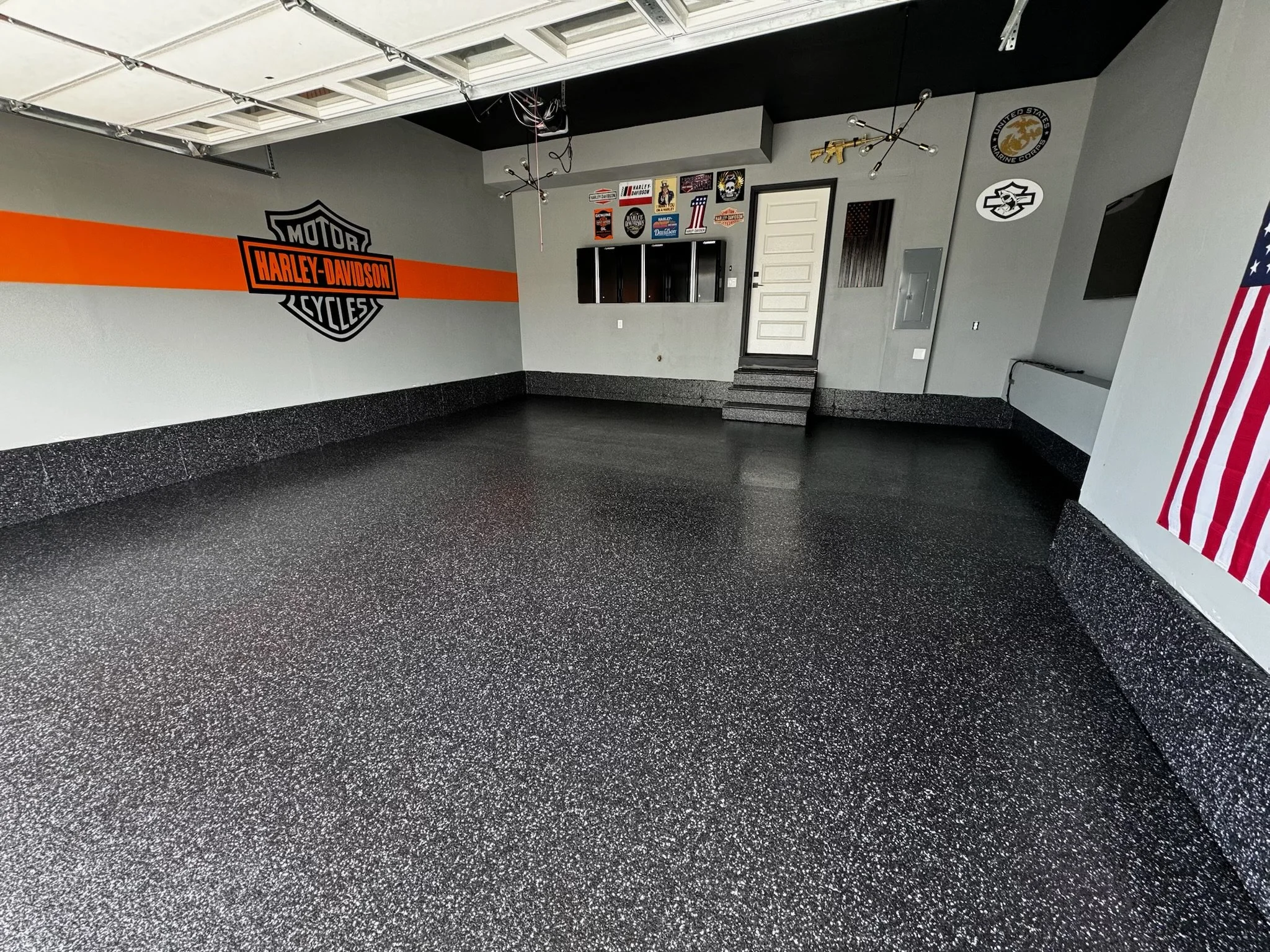 Flake floors combine beauty and function. Made by broadcasting decorative vinyl chips into a tinted epoxy base, they offer a textured, slip-resistant finish that hides dirt and imperfections. Great for garages, patios, basements, and commercial spaces, flake floors are tough, UV-stable, and customizable with endless color blends.