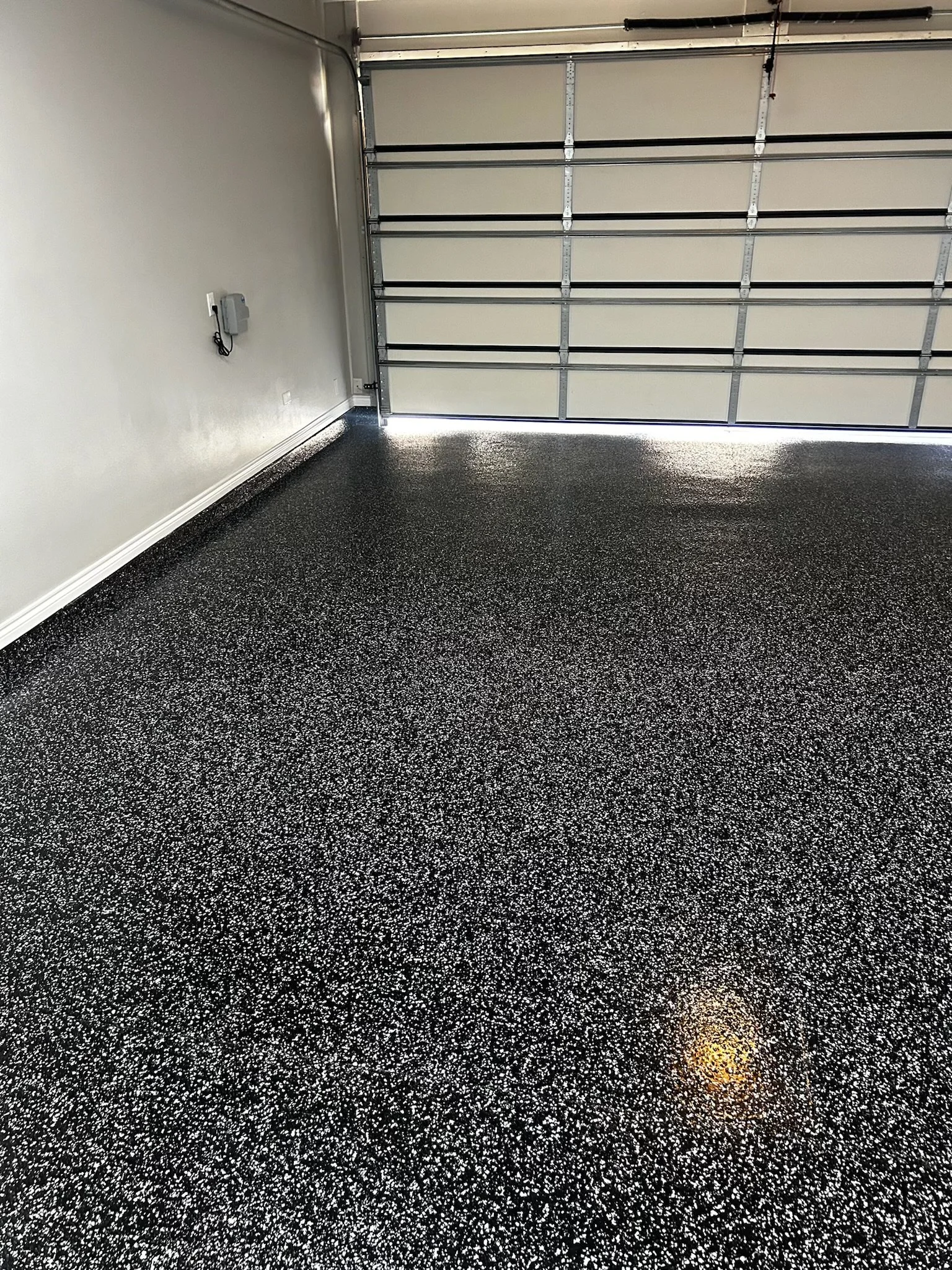 Empty garage with speckled black and white epoxy floor, white walls, and closed gray garage door.